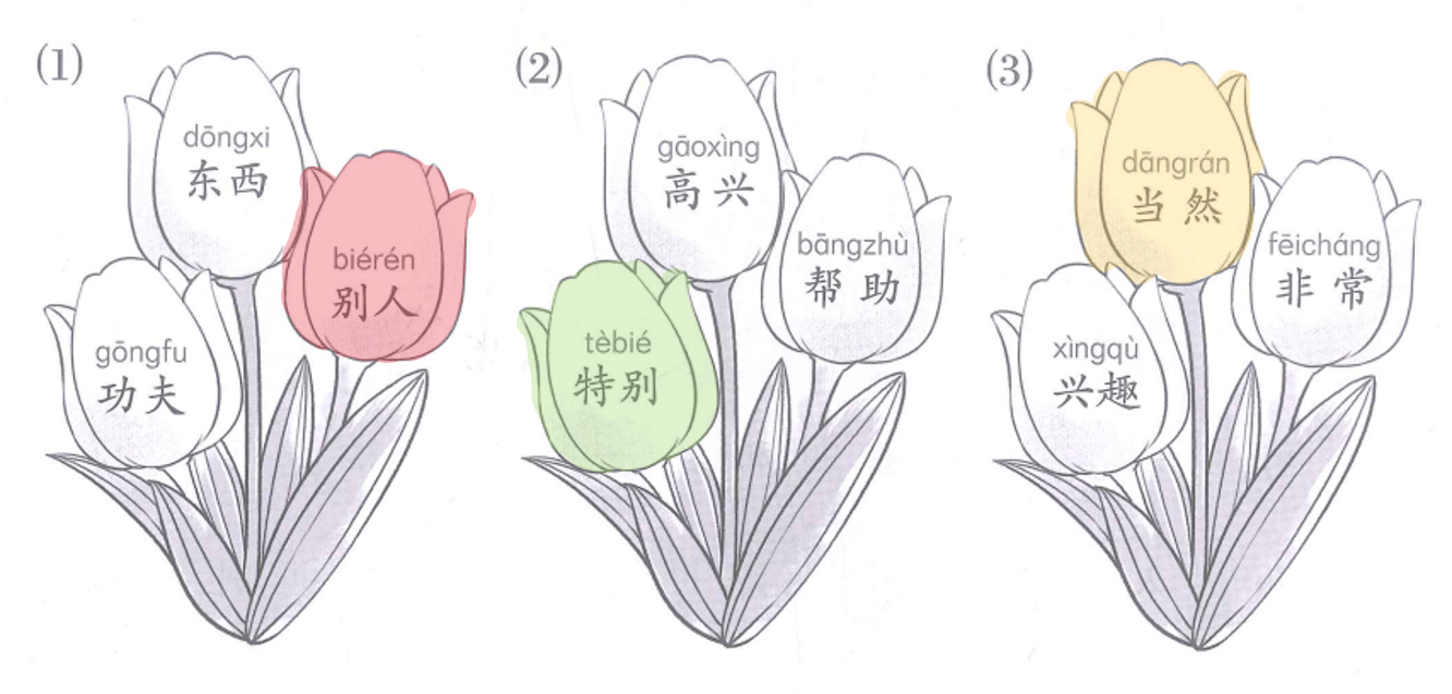 读词语,给每组中声调不同的词语涂颜色。Đọc các từ sau, tô màu bông hoa chứa từ có thanh điệu khác với hai từ còn lại trong mỗi nhóm.