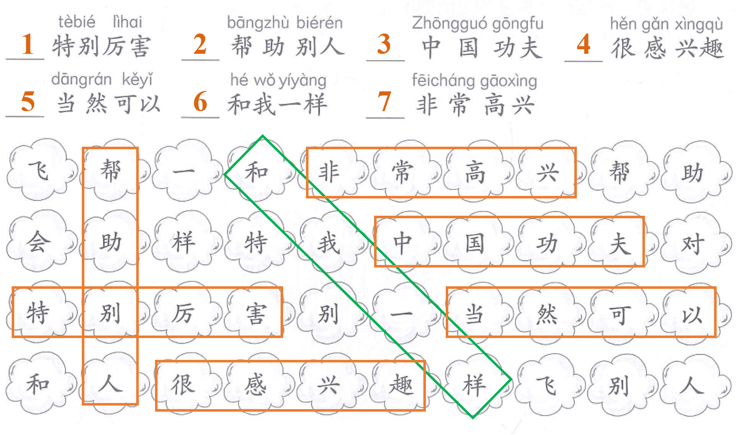 Trước tiên học sinh đọc những cụm từ dưới đây. Sau đó giáo viên đổi thứ tự và đọc những cụm từ này. Dựa vào đó học sinh đánh số thứ tự cho các cụm từ rồi khoanh tròn trong hình bên dưới.