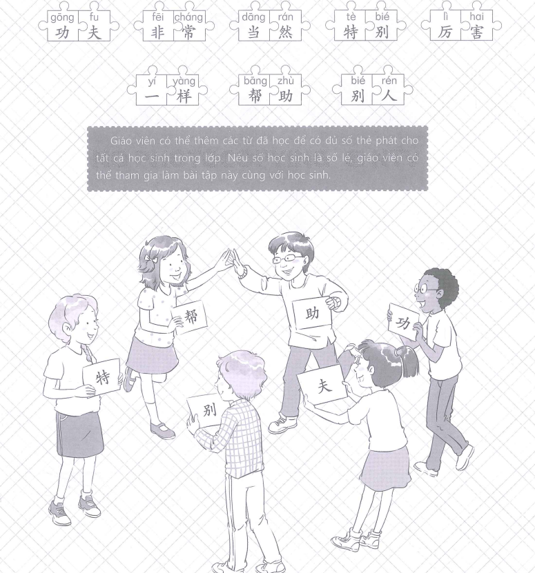 读下列词语,然后找到拿着可以与你手中的字组成词语的卡片的同学。Trước tiên đọc các từ dưới đây. Sau đó em sẽ được phát một thẻ có ghi một chữ. Tìm người bạn cầm thẻ có chữ ghép được với chữ trên thẻ của em tạo thành một từ.