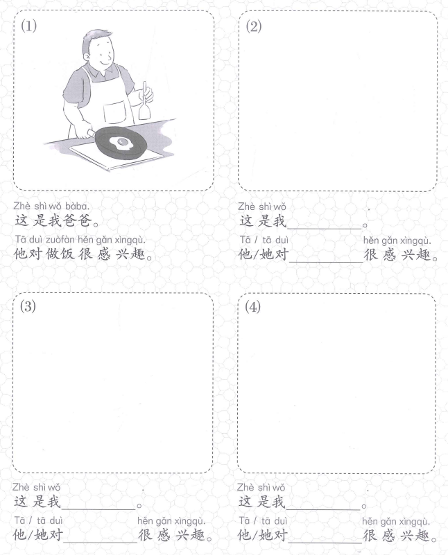 和家人谈论他们的兴趣,写下来,并发挥想象画一画。Nói chuyện với những người thân trong gia đình em về sở thích của họ, sau đó viết lại (bằng chữ Trung Quốc hoặc phiên âm) và vẽ hình minh hoạ.