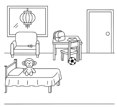 🔊 我的房间有一个很大的窗户,窗户上挂着一个灯笼。窗户下边放着一个沙发。沙发前边放着一张床,床上放着我的玩具猴子。门口放着一张桌子和一把椅子,桌子上放着我的书包和一个信封,椅子下放着我的足球。