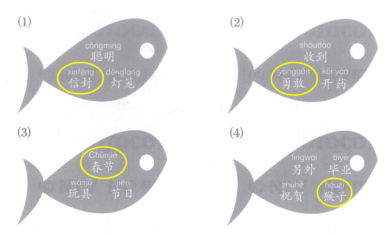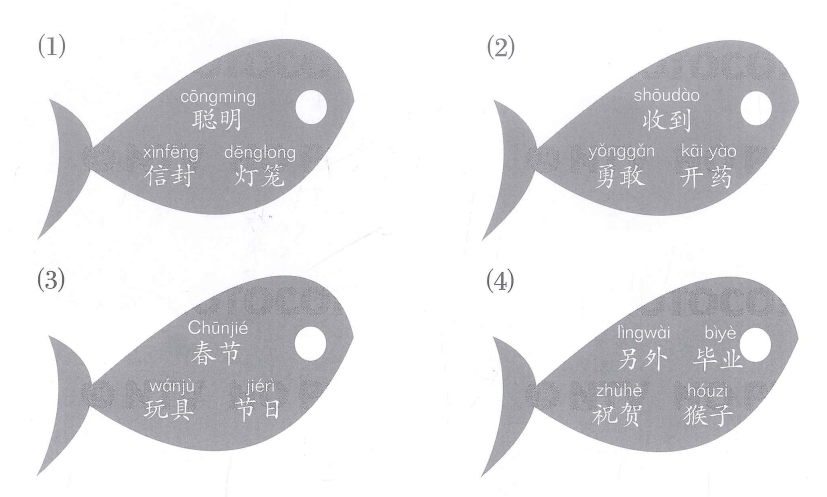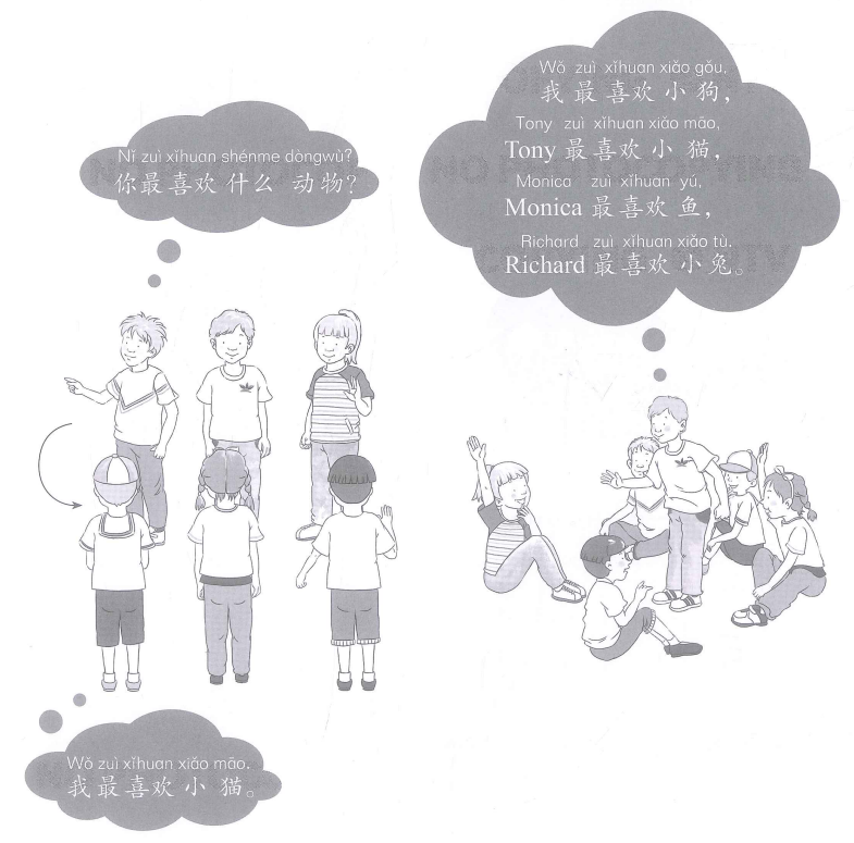 - Wǒ zuì xǐhuan yú, Tony zuì xǐhuan xiǎo gǒu, Monica zuì xǐhuan xiǎo māo, Richard zuì xǐhuan xiǎo tù.