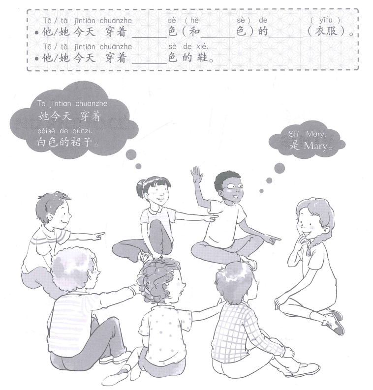 观察班里同学今天的穿着,用下列句式描述一个同学的穿着,请其他同学猜你说的是谁。Quan sát xem hôm nay các bạn trong lớp mặc trang phục gì, dùng mẫu câu dưới đây để miêu tả trang phục của một bạn, sau đó yêu cầu các bạn khác đoán xem người bạn em nói đến là ai.