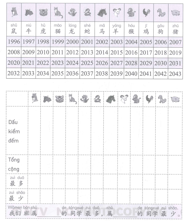 Xem bảng con giáp và năm bên dưới, tìm con giáp của em. Sau đó làm một cuộc khảo sát trong lớp về con giáp của từng bạn, đếm xem con giáp nào nhiều nhất, con giáp nào ít nhất.