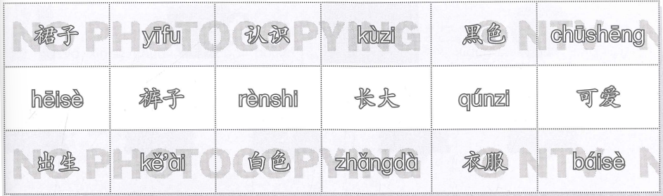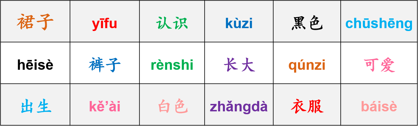 读出下面的汉字和拼音,把对应的汉字和拼音涂上相同的颜色。Đọc các từ và phiên âm dưới đây, tô cùng màu cho chữ Hán và pinyin tương ứng.
