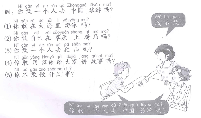 (4) 你敢用汉语给大家讲故事吗?