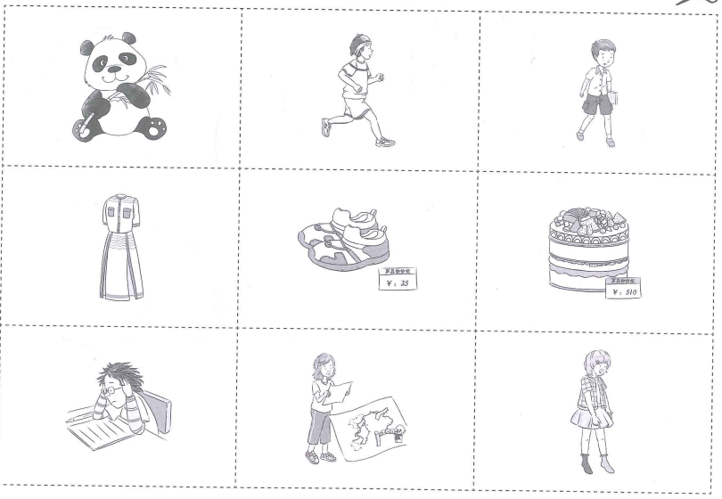 把第 91 页的图片剪下来贴到 Bingo 图中,然后听老师说句子,根据老师说的句子圈出图画,先连成一条线者胜利。Cắt các hình ở trang 91 và dán vào bảng bingo bên dưới. Sau đó nghe giáo viên đọc câu rồi khoanh tròn hình dựa vào câu em nghe được. Học sinh nào là người đầu tiên khoanh được ba hình tạo thành đường thẳng thì em đó chiến thắng.