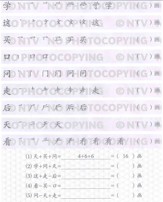 (1) 数一数。Đếm. Dùng ngón trỏ đồ lên các nét của chữ bên dưới rồi đếm xem chữ có bao nhiêu nét.