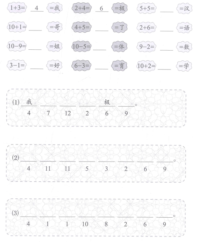 先数一数下列汉字的笔画数,然后计算不同汉字组合的总笔画数。