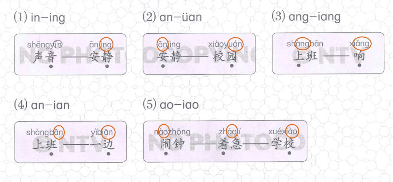 读每组韵母,想一想有什么不同,然后圈出加点字的韵母并读一读。Đọc từng nhóm vần mẫu, suy nghĩ xem hai vần mẫu trong mỗi nhóm khác nhau ở điểm nào, sau đó khoanh tròn vần mẫu của chữ có dấu chấm phía dưới rồi đọc to.