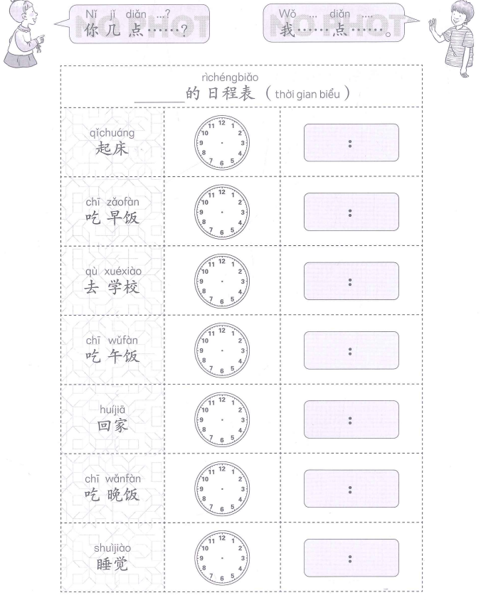 两人一组,互相询问对方每天的日常安排,为同伴做一张日程表,先在钟表上画出时间,然后把时间写下来。Hai học sinh lập thành một nhóm, hỏi nhau về lịch sinh hoạt hằng ngày, em này lập thời gian biểu cho em kia. Trước tiên vẽ kim giờ và kim phút trên mặt đồng hồ để thể hiện mốc thời gian, sau đó viết giờ vào ô trống bên cạnh.