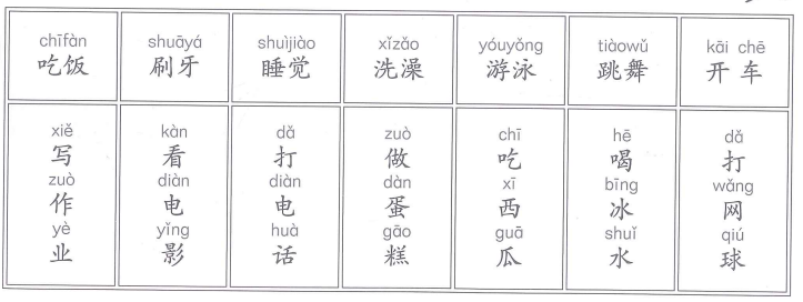 🔊 刷牙 shuāyá — đánh răng 🔊 睡觉 shuìjiào — ngủ 🔊 看电影 kàn diànyǐng — xem phim 🔊 打网球 dǎ wǎngqiú — chơi tennis 🔊 吃西瓜 chī xīguā — ăn dưa hấu