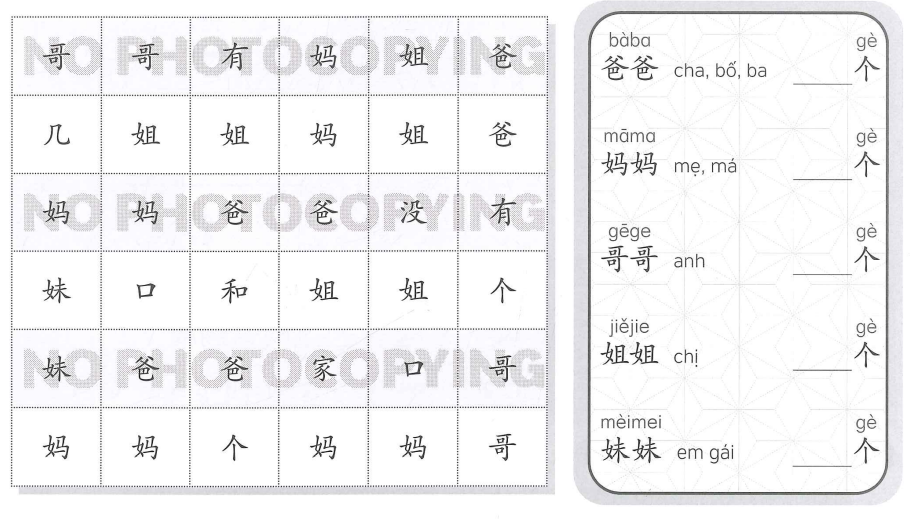 Đếm xem trong bảng sau có mấy từ 爸爸, có mấy từ 妈妈, có mấy từ 哥哥, có mấy từ 姐姐, có mấy từ 妹妹.