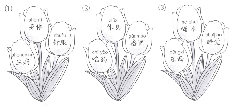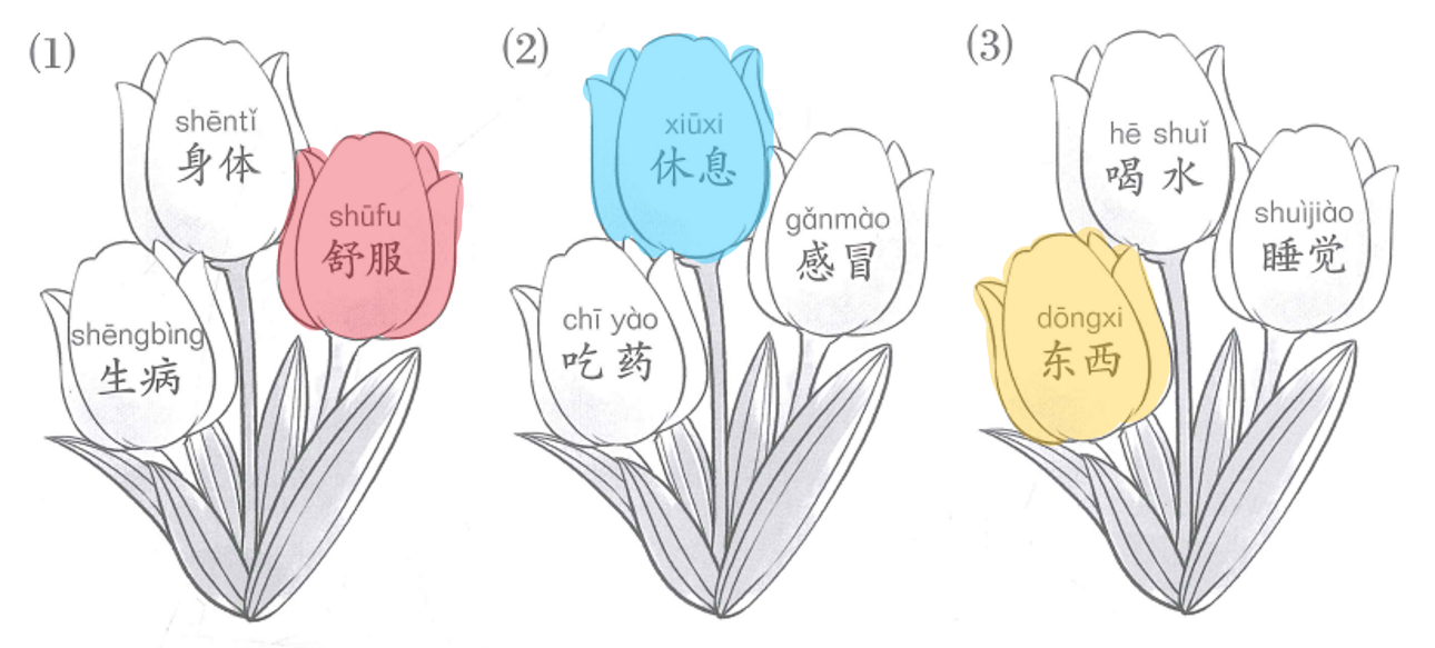 (1) →  Từ có thanh nhẹ: 舒服 (shūfu) → tô màu cho hoa chứa từ này