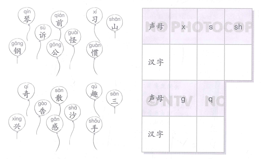 将下列汉字按声母归类。Phân loại các chữ sau dựa vào thanh mẫu.