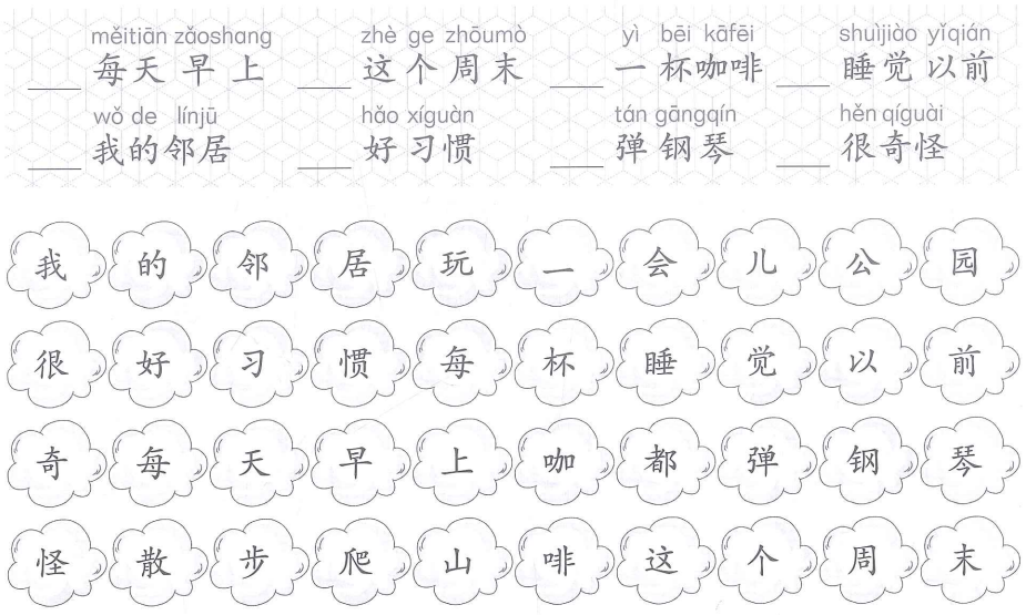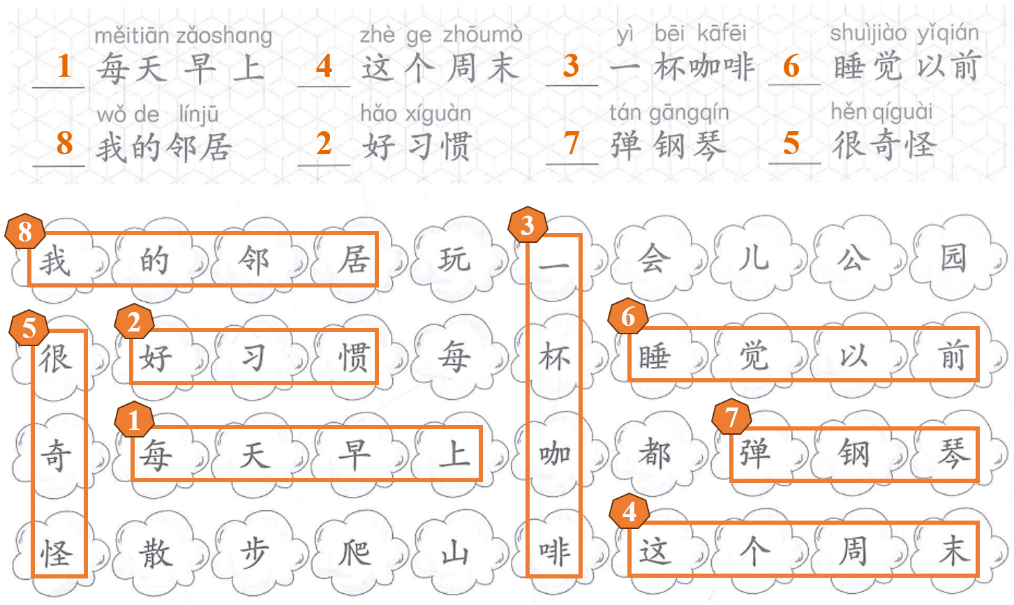 先读下列词语,然后老师变换顺序再读一遍,按照老师读的顺序填写序号,并在下边的图中圈出来。Trước tiên học sinh đọc những cụm từ dưới đây. Sau đó giáo viên đổi trật tự và đọc những cụm từ này. Dựa vào đó học sinh đánh số thứ tự cho các cụm từ rồi khoanh tròn trong hình bên dưới.