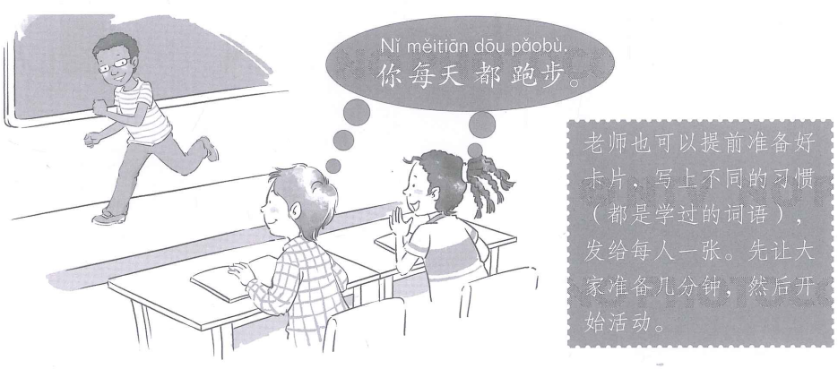 Giáo viên chuẩn bị một số thẻ, trên mỗi thẻ có ghi câu miêu tả một thói quen. Giáo viên đọc câu, các học sinh có thói quen đó lập tức đứng dậy và lặp lại câu thật to rồi ngồi xuống. Với những học sinh không có thói quen như thế, giáo viên hướng dẫn các em cùng nói: 我们都没有这个习惯。 (Chúng em không có thói quen này.)