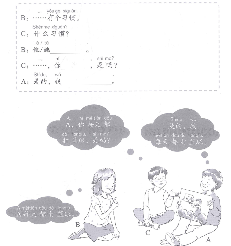 Ba học sinh lập nhóm, mỗi em vẽ một bức tranh miêu tả thói quen của bản thân. A cho B xem tranh, B cho C xem tranh và C cho A xem. Sau đó, ba em hoàn thành đoạn hội thoại bên dưới. Hãy thực hiện như vậy ba lần để em nào cũng có cơ hội nói về thói quen của mình.