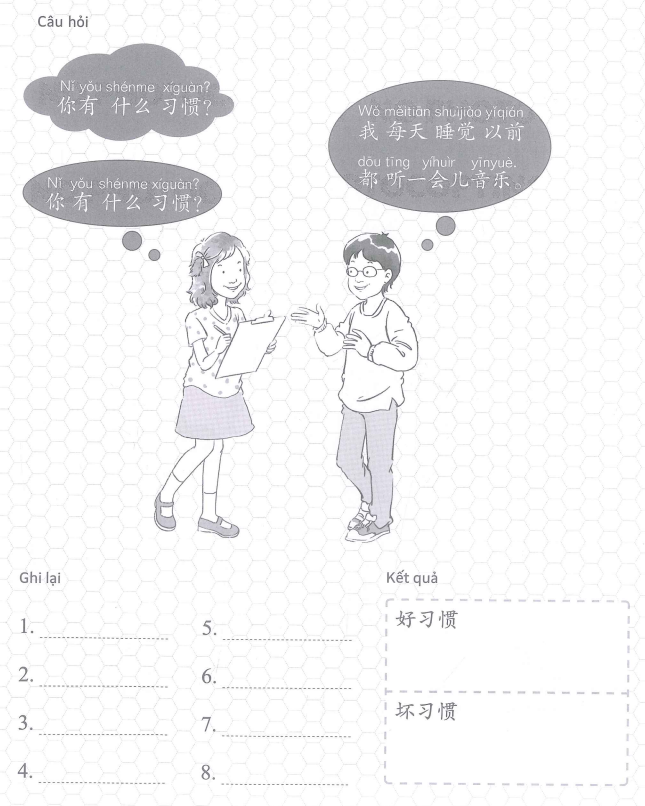 调查 5–8 个人,问问他们都有什么习惯。将好习惯和坏习惯分类,然后向全班报告。Chọn 5–8 người và hỏi xem họ có thói quen gì. Phân loại thói quen thành nhóm thói quen tốt và thói quen xấu, sau đó trình bày trước lớp.