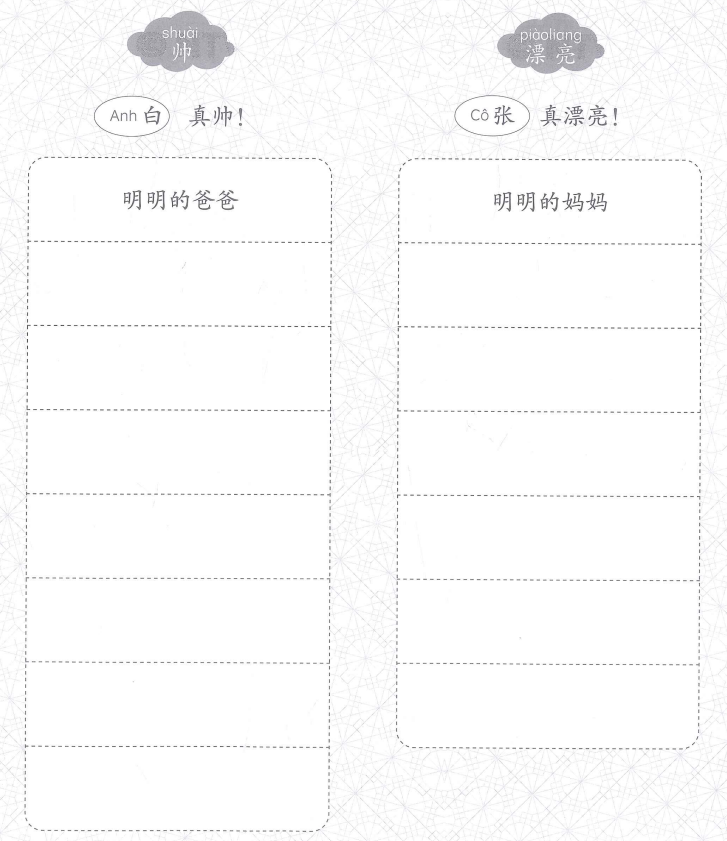 → Qua bài học này, các em đã luyện được cách miêu tả người bằng tiếng Trung, biết nói về chiều cao, khuôn mặt, đặc điểm nổi bật và một số tính cách cơ bản. Các bài tập trong SBT giúp các em củng cố khả năng quan sát, diễn đạt và phản xạ ngôn ngữ ở nhiều tình huống khác nhau. Hãy học tập và luyện tập chăm chỉ, ôn lại bài thường xuyên để tiếp thu nhanh hơn và sớm nâng cao kỹ năng tiếng Trung của mình nhé!