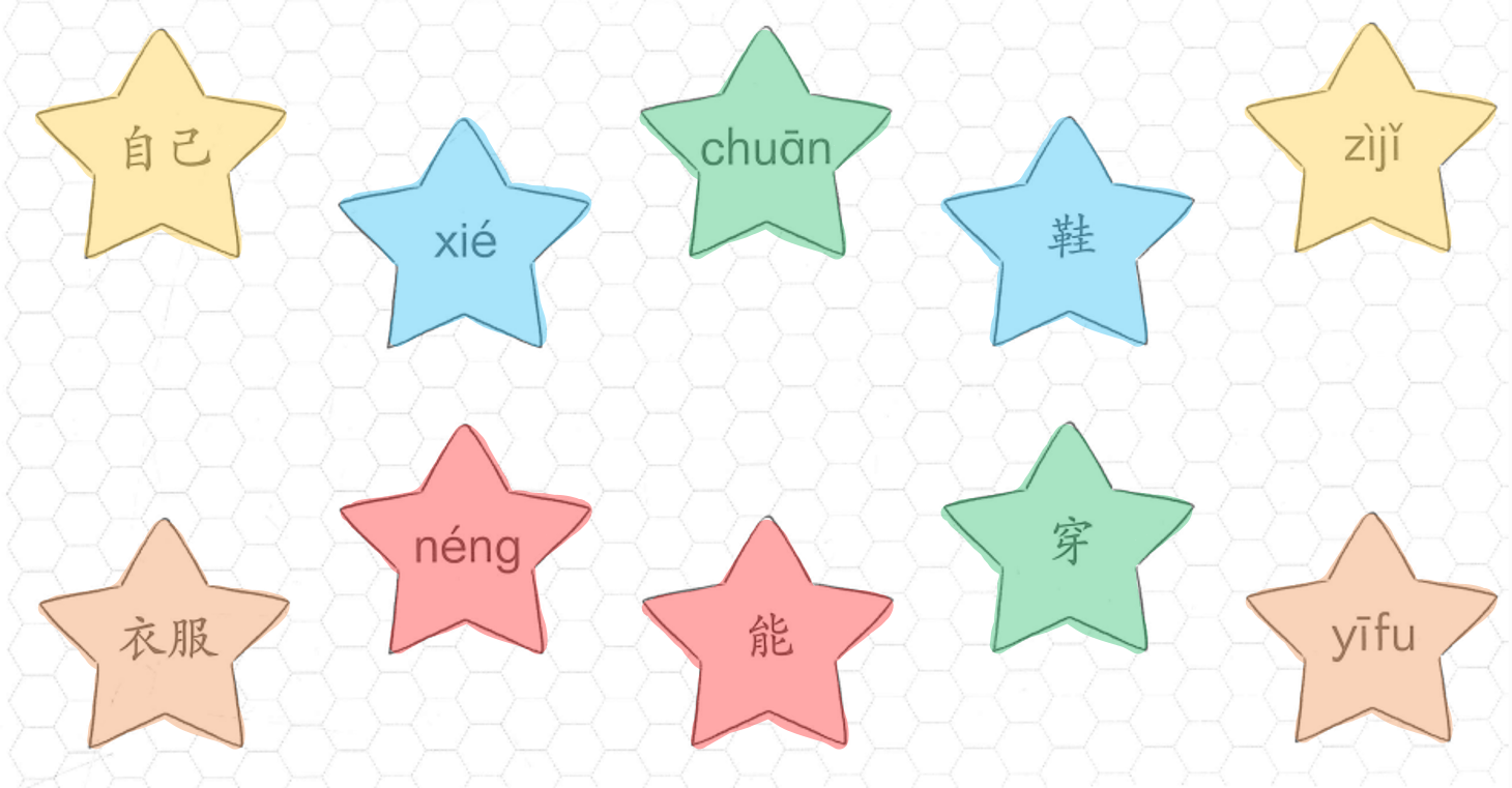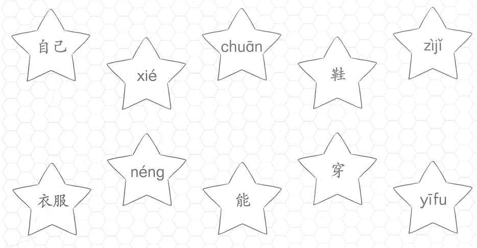 给汉字和对应的拼音涂上相同的颜色。Tô cùng màu cho ngôi sao có chữ và phiên âm tương ứng.