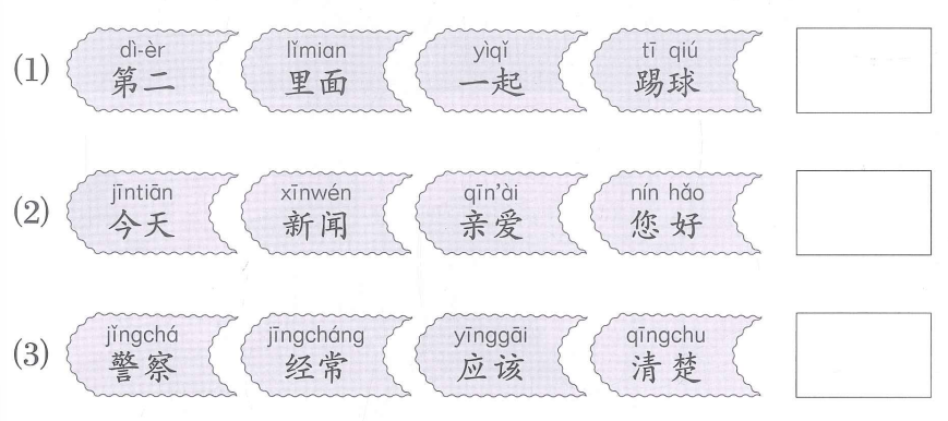 (2) jīntiān 🔊 今天 – xīnwén 🔊 新闻 – qīn’ài 🔊 亲爱 – nín hǎo 🔊 您好
