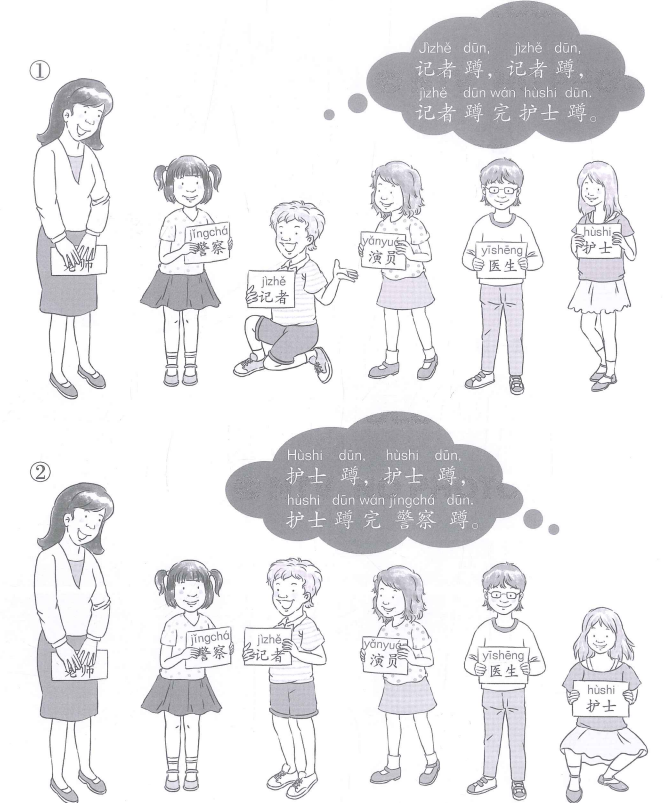学生站成一排,每人选择一种职业,玩跨起游戏。Các học sinh đứng thành một hàng, mỗi em chọn một nghề và chơi trò chơi ngồi xổm theo hướng dẫn dưới đây.