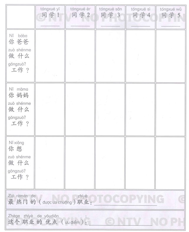 几人一组,根据下表做调查,然后在班级里汇报。Lập nhóm gồm một số học sinh, làm khảo sát dựa vào bảng dưới đây, sau đó trình bày trước lớp.
