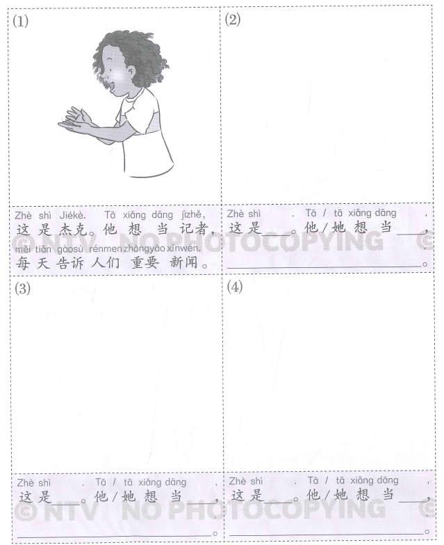 - Zhè shì Jiékè. Tā xiǎng dāng jìzhě, měitiān gàosu rénmen zhòngyào xīnwén.