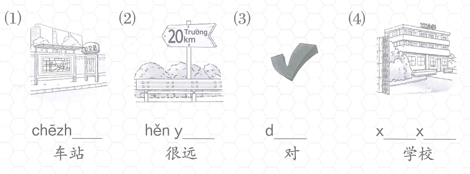 看图片,根据图片和汉字提示补全拼音。Nhìn hình, dựa vào hình và chữ, điền vận mẫu và thanh điệu vào chỗ trống trong các âm tiết.