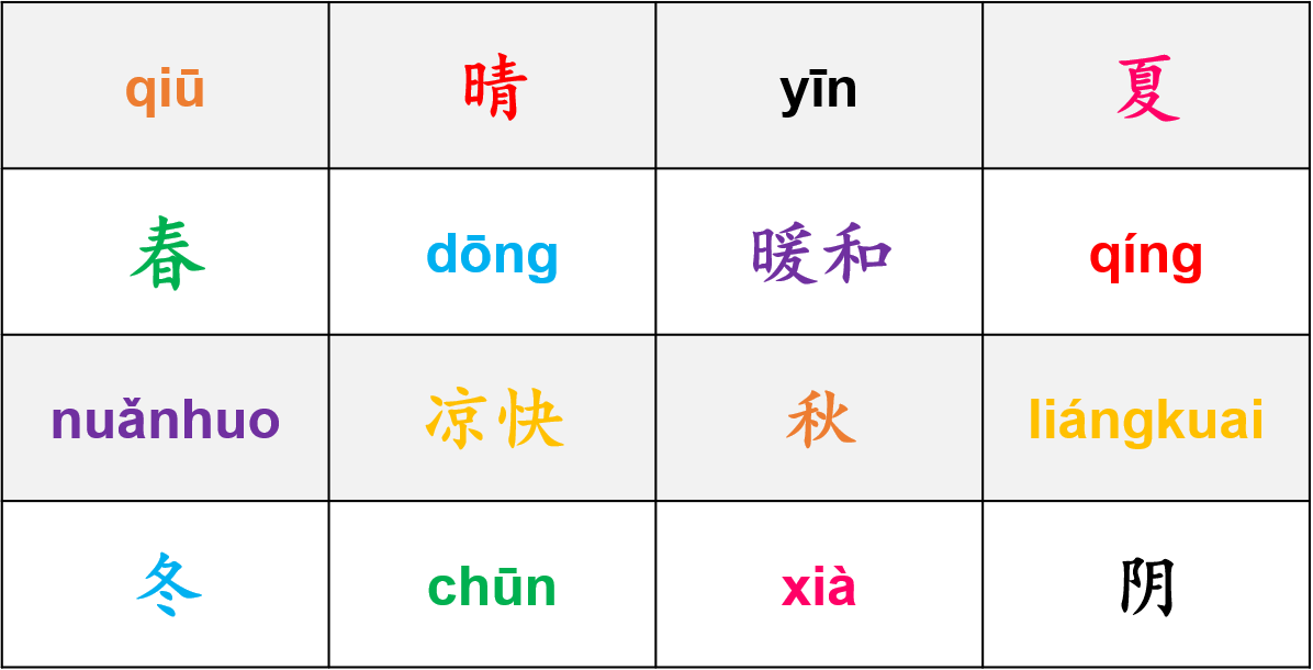Mùa  春天 chūntiān 夏天 xiàtiān 秋天 qiūtiān 冬天 dōngtiān