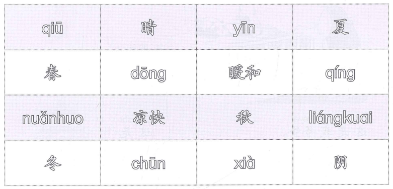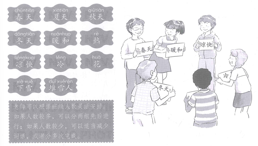 老师给每个学生一张卡片,上面写着不同的季节和词语,大家同时展示自己的卡片,然后迅速找到和自己相匹配的词语,站在一起。Giáo viên phát cho mỗi học sinh một thẻ, trên thẻ có viết từ/cụm từ chỉ mùa và đặc điểm của các mùa. Các học sinh cùng xem thẻ của mình, sau đó nhanh chóng tìm bạn cầm thẻ có từ/cụm từ phù hợp với từ/cụm từ trên thẻ của mình rồi đến đứng cạnh bạn ấy.