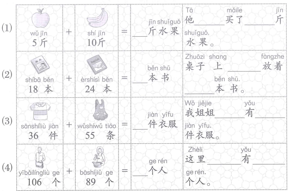 (1) 5 斤 + 10 斤 = 15 斤水果